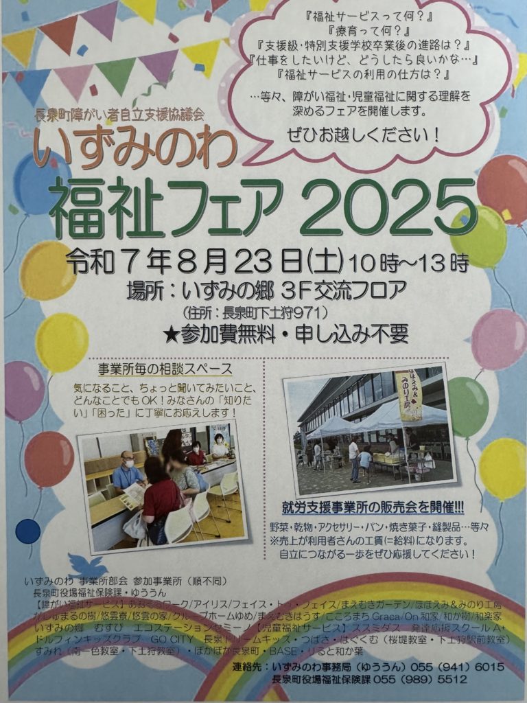 いずみのわ福祉フェア 2025 2025年8月3日 8月23日(土) 10:00~13:00 いずみの郷(長泉町下土狩971)にて障害福祉・児童福祉に関する理解を深めるフェアを開催します。 がじゅまるの樹も参加します。自主製品等の販売にも参加させていただきます。 どうぞ、お立ち寄りください!