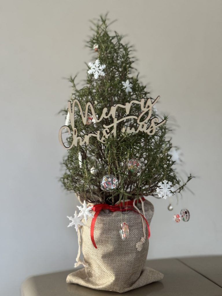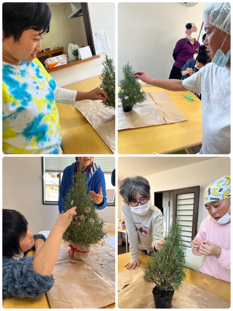 ローズマリーのクリスマスツリー 2025年12月7日 今年度、同じ町内の就労継続支援B型事業所のフェイス・トゥー・フェイスさんとのコラボ企画していた、ローズマリーのクリスマスツリーが遂に完成しました!! がじゅまるの樹では、畑でローズマリーを育てて、カップに植え替える作業を担当し、オーナメントをフェイス・トゥー・フェイスさんが作成してくださいました。 あまりに素敵なクリスマスツリーだったので、事業所でも皆で飾り付けをしました! 素敵なクリスマスをお過ごしください~🎄