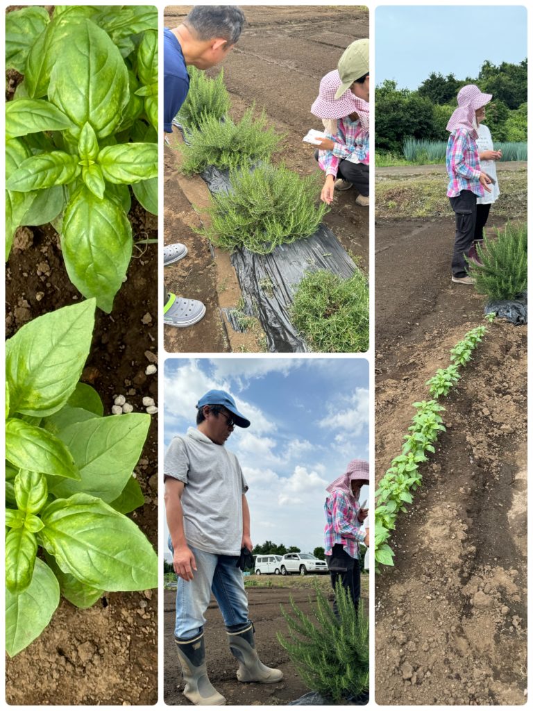 事業所連携 2024年6月27日 同じ町内の事業所さんとのコラボ企画で、畑にローズマリー、バジルを植えて育てています。今日は収穫、乾燥の仕方についてのレクチャーを受けました。いずれ、七味唐辛子やハーブソルトに生まれ変わるとの事。頑張って育てたり、収穫、乾燥の作業をしたいと思います。お忙しい中、丁寧に説明をしていただいたN様ありがとうございました。