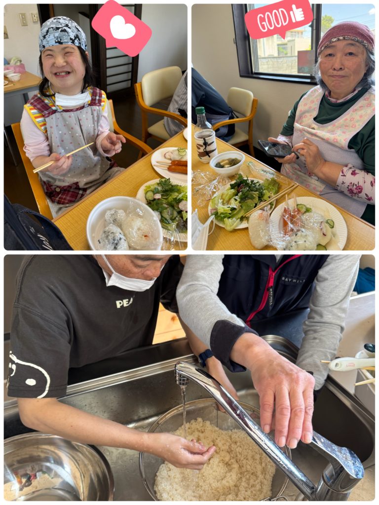 5月のわくわくDAYでは「健康に気をつけた昼食を作ろう」と題し、おにぎり、味噌汁、漬物、フランクフルト、サラダというヘルシーメニューを皆で作りました。事前に、コンビニのおにぎりを使ってカロリーの勉強会を昼休みに開き、おにぎりの具の工夫によって健康的な食事ができるということを学びました。お味噌汁の具と漬物とサラダの野菜は、自分たちで育てた畑で採れた採れたて野菜を使ったのでとってもおいしかったです!