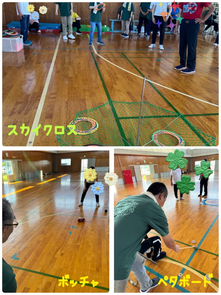 暑い中でしたが、長泉町の体育指導員さんにご指導してもらい、「ボッチャ」「ペタボード」「スカイクロス」というニュースポーツを楽しみました。